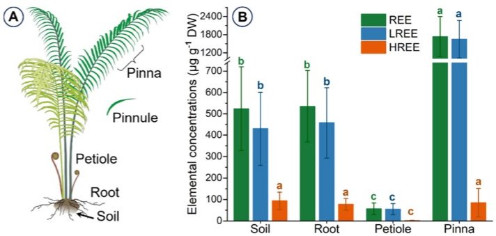 Second, we need to say a few words about the parts of the fern that were analysed for REEs. Doing so is made a lot easier by reference to the image above – Fig. 1 from the paper by He et al. (2025). By analogy with a flowering plant, the parts of the fern sampled were the root (the underground portion), the pinna (the fern equivalent of a leaf [also known as a ‘frond’ (Alejandro Vasco et al., 2013)]) whose component parts are termed pinnules – which are a little like a flowering plant’s ‘leaflets’), and the ‘petiole’ [also called a ‘stipe’ (Alejandro Vasco et al., 2013)], a stem-like part that connects the pinnae to the roots. For – essential – purposes of comparison, He et al. (2025) also sampled the soil in which the fern was growing. Their main results are illustrated in Fig. 1B (which is also helpfully reproduced at the top of this post).