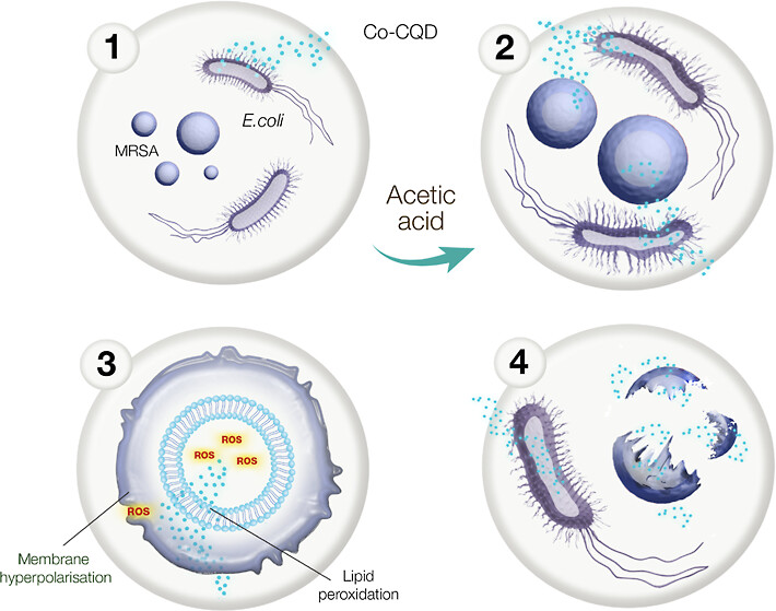 In their work, Truskewycz et al. (2025) harnessed the pH-lowering property of acetic acid with the antimicrobial capability of nanoparticles (Suresh K Mondal et al., 2024; Hamed Salmani-Zarchi et al., 2024; Ayman Elbehiry & Adil Abalkhail, 2025), ‘carbon dots’ in particular (Xiuli Dong et al., 2017; 2020; Mattia Ghirardello et al., 2021). Accordingly, Truskewycz et al. (2025) utilised cobalt-doped carbon quantum dots (CGDs). CGDs were chosen for their “biocompatibility and potential for functional chemical modifications”; cobalt was used because of its “documented antimicrobial activity”**.