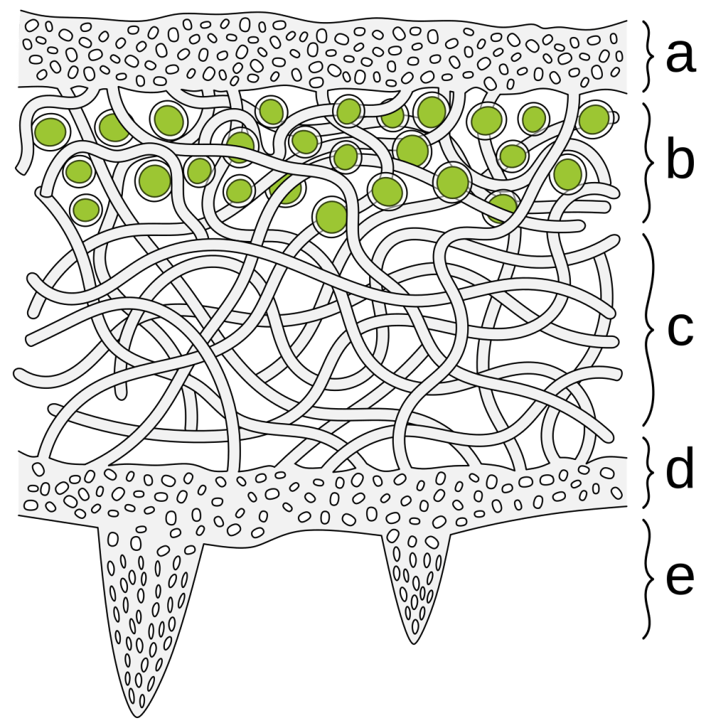 This image, entitled “Schematic cross section of foliose lichen: (a) The cortex is the outer layer of tightly woven fungus filaments (hyphae); (b) This photobiont layer has photosynthesizing green algae; (c) Loosely packed hyphae in the medulla; (d) A tightly woven lower cortex; (e) Anchoring hyphae called rhizines where the fungus attaches to the substrate”, by Nefronus, is used under the Creative Commons Attribution-Share Alike 4.0 International license.