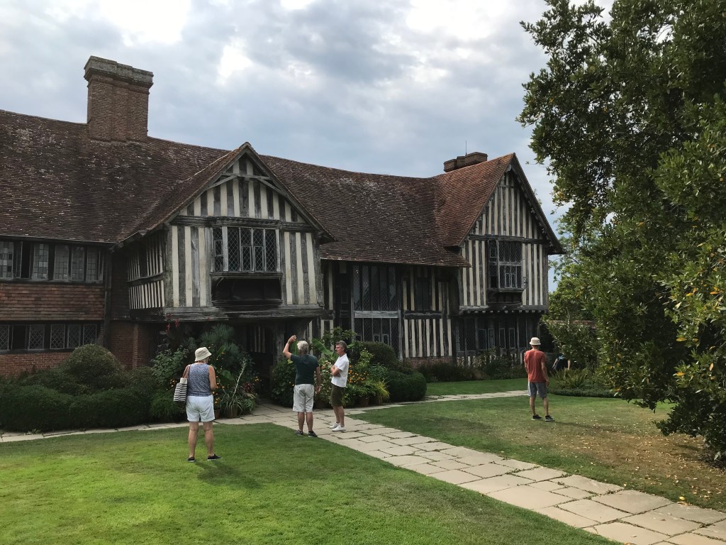 The image shows visitors admiring the Tudor building at Great Dixter (home of garden designer, writer and plant enthusiast Christopher Lloyd). The house features wooden timbers prominently in its construction, the lawns provide a pleasant surface to walk upon, and the trees and border plants beautify this location. Several plant uses – and people – in one picture…